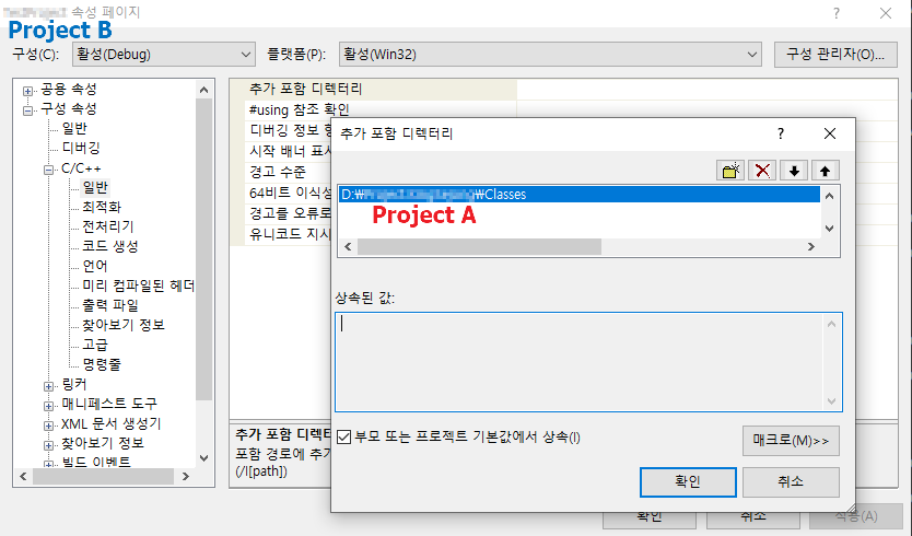 B 프로젝트에서 A 프로젝트에 있는 ###.h 파일을 include 하려하는 경우에 발생함.