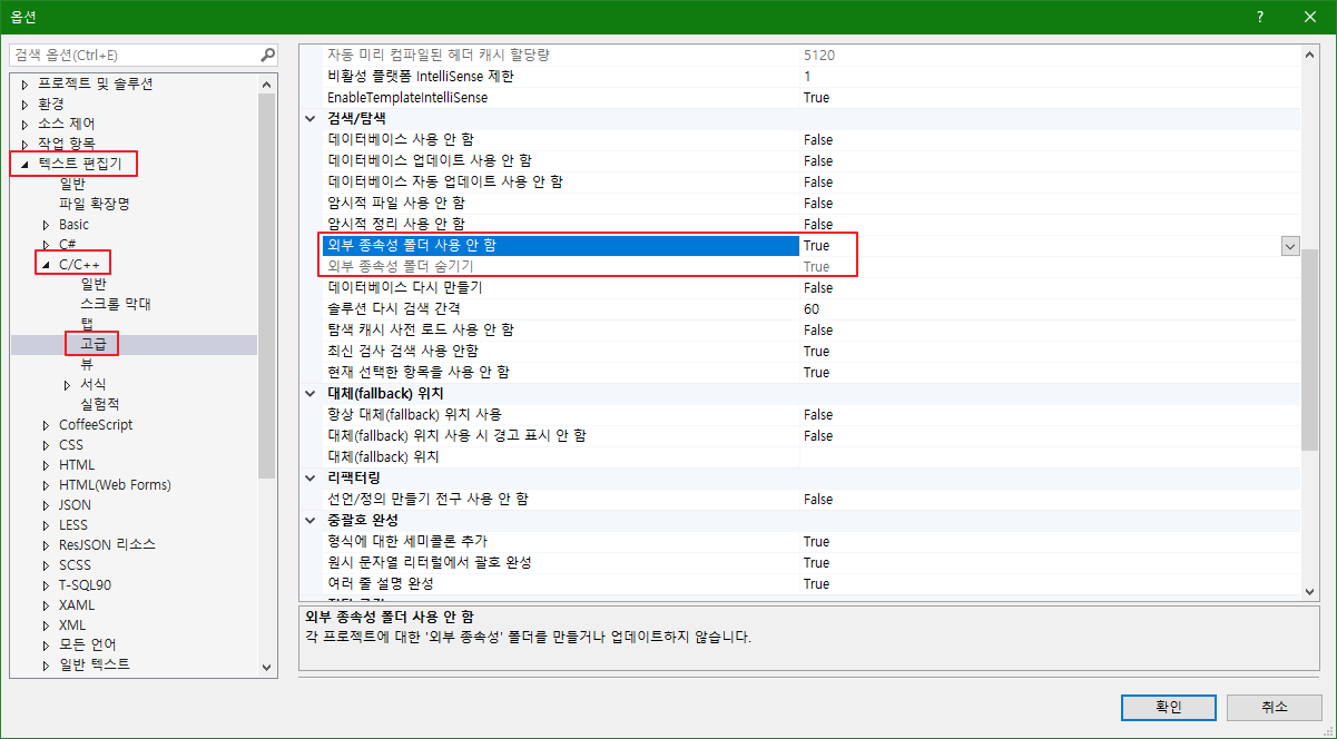 도구 - 옵션 - 텍스트 편집기 - C/C++ - 고급 - 검색/탐색 - 외부 종속성 폴더 사용 안 함 - TRUE