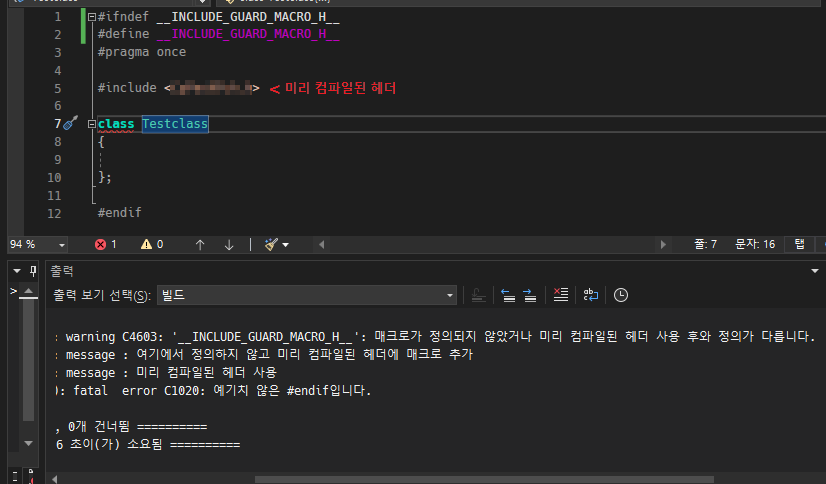 평소처럼 미리 컴파일된 헤더를 include 하고, 그 전에 중복 include를 막기 위해 ifndef / define 을 사용하고, #pragma once 를 사용했는데 갑자기 나타난 에러와 경고