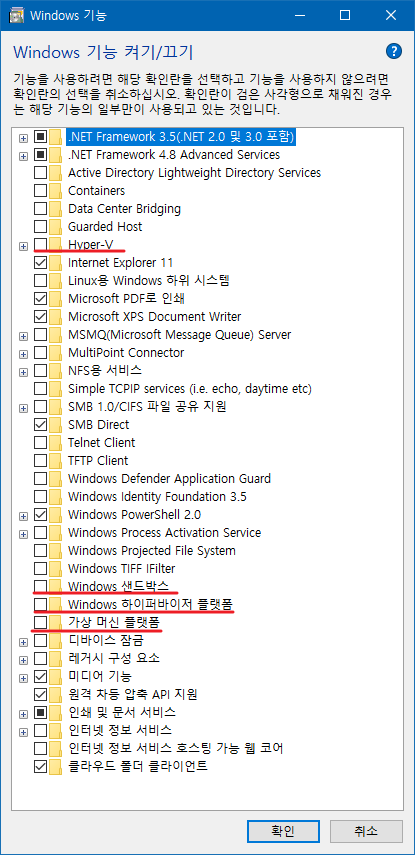 정리 : Hyper-V / Virtual Machine Platform( 가상 머신 플랫폼 ) / Windows Hypervisor Platform ( Windows 하이퍼바이저 플랫폼 ) 이 세 개 중에 보이는 게 있으면 모조리 체크 해제