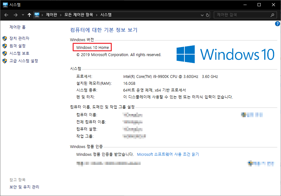 특이하게 Windows 10 Home은 버전에 따라 다른데,