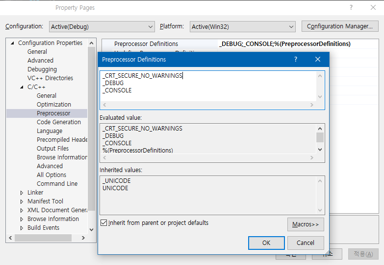2. "Project -> Properties -> C/C++ -> Preprocessor -> Preprocessor Definitions" 에