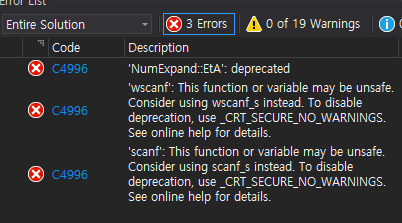밑에 있는 두 개의 에러는 안전하지 않은 라이브러리의 함수를 이용함에 따라 뜨는 에러다.